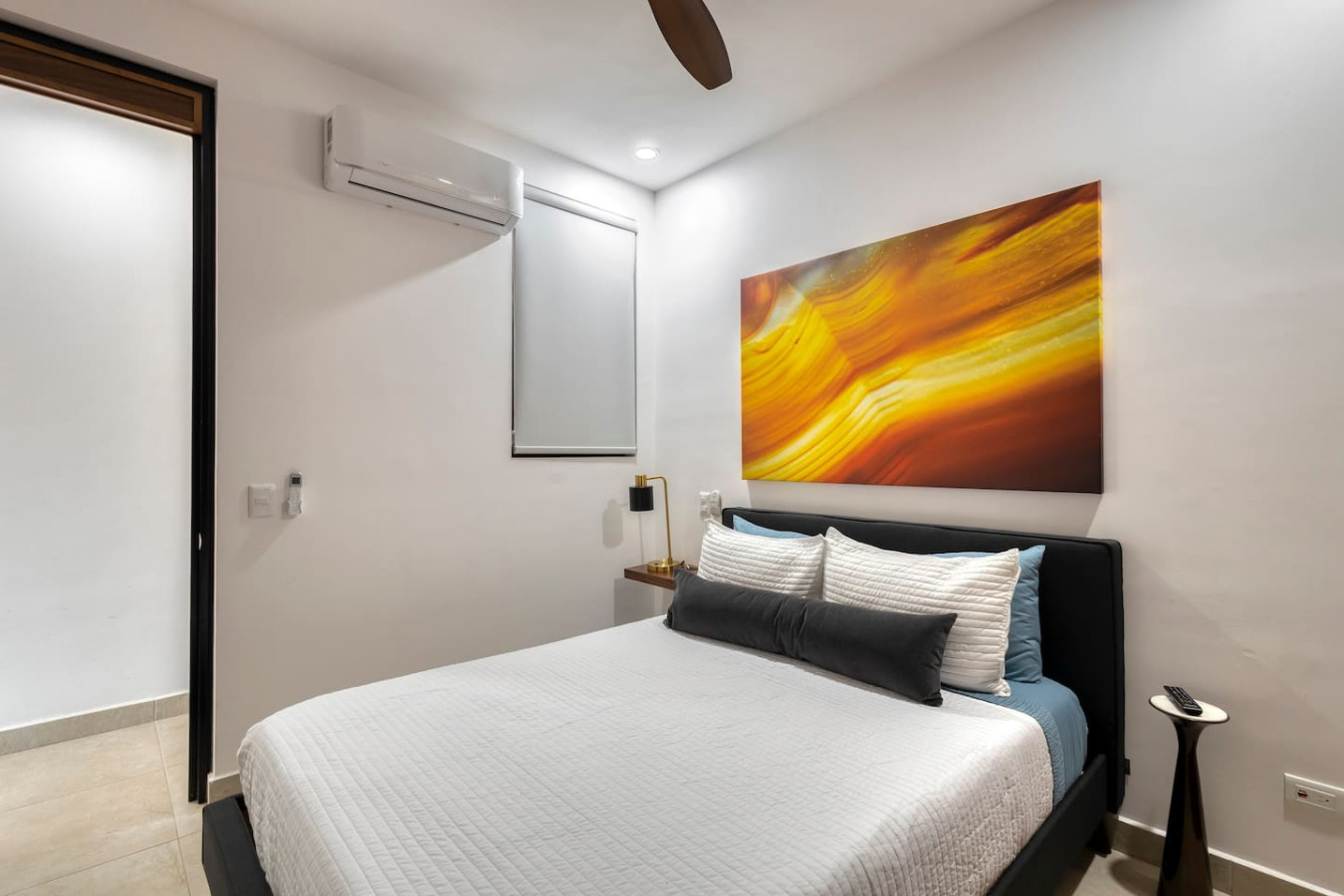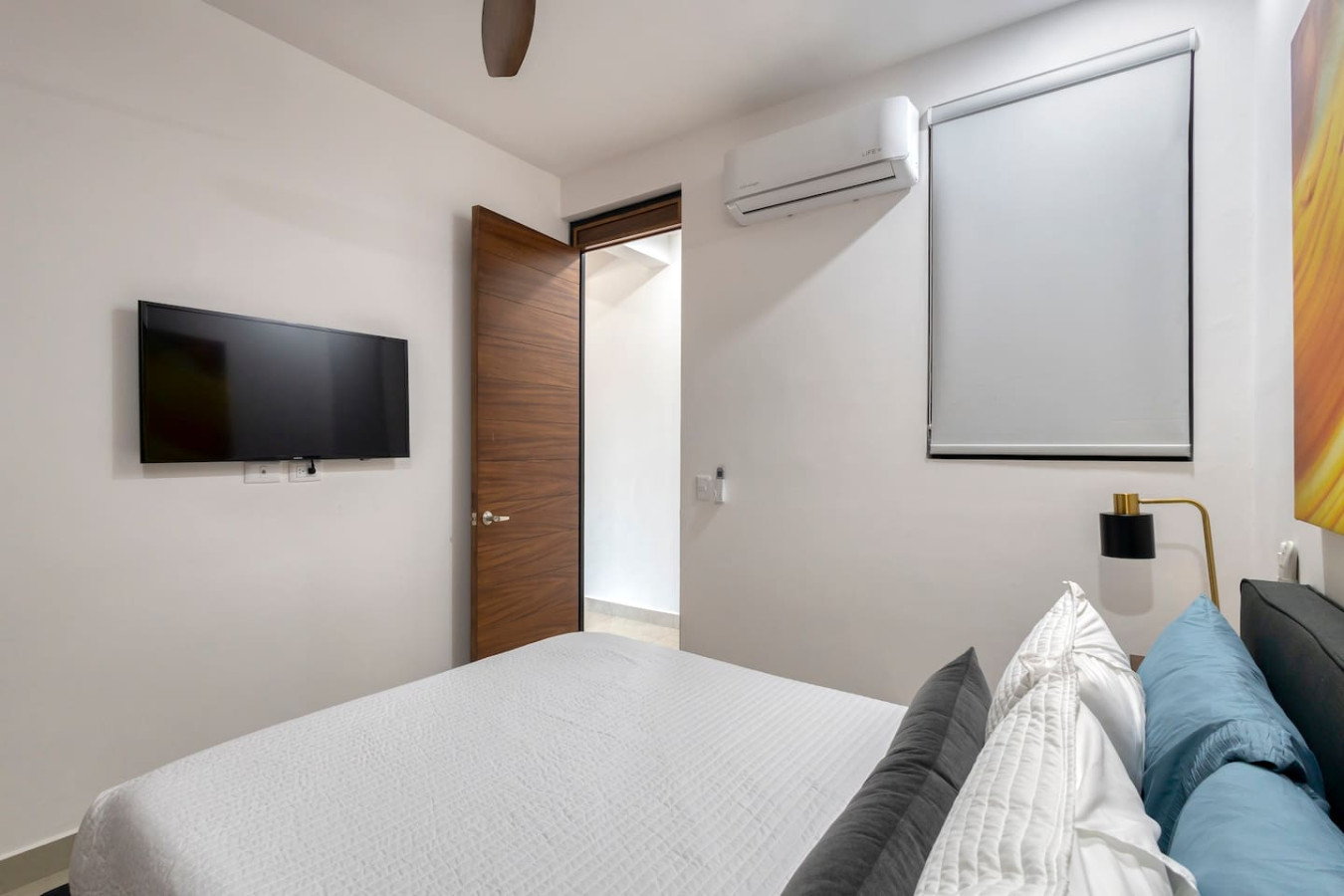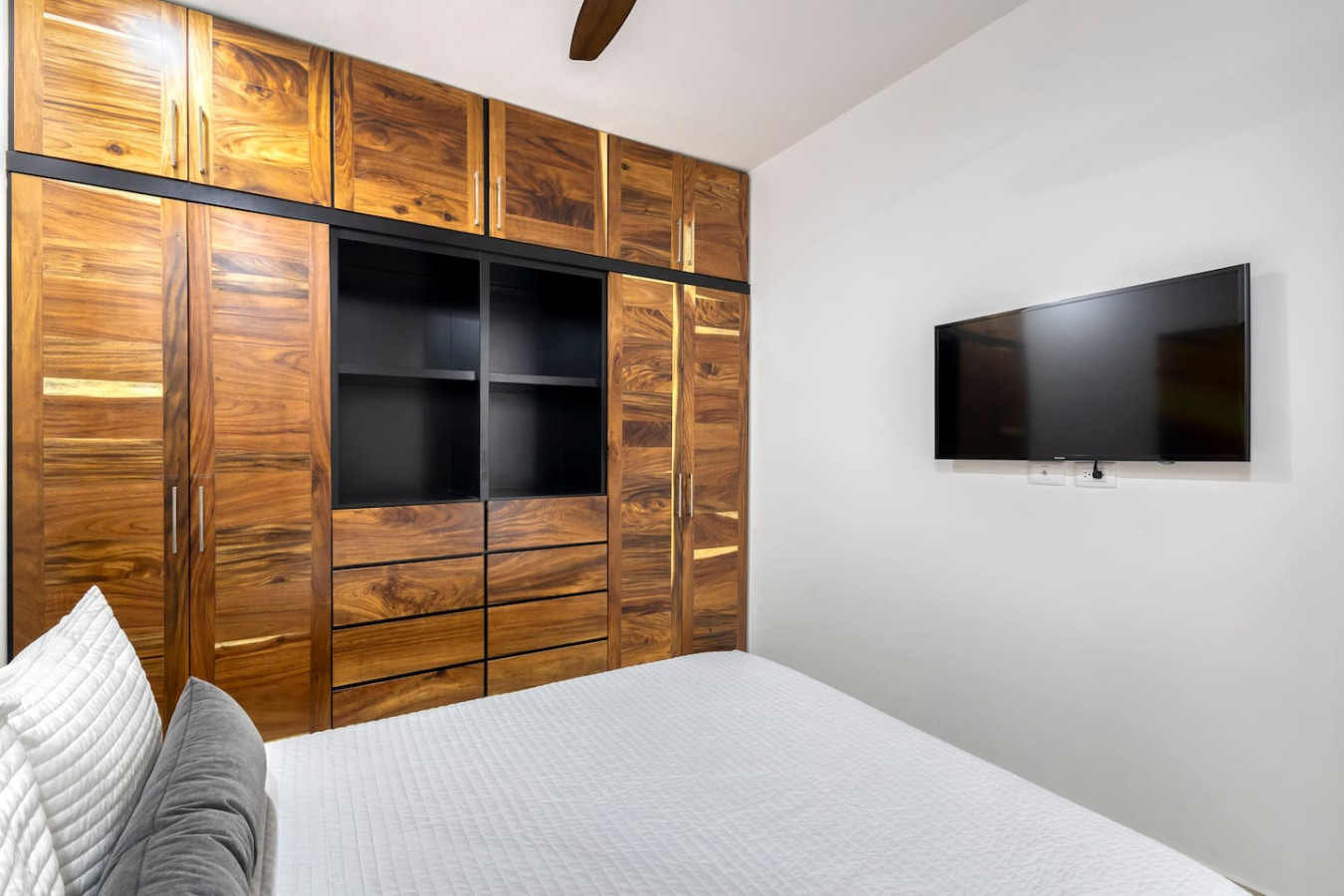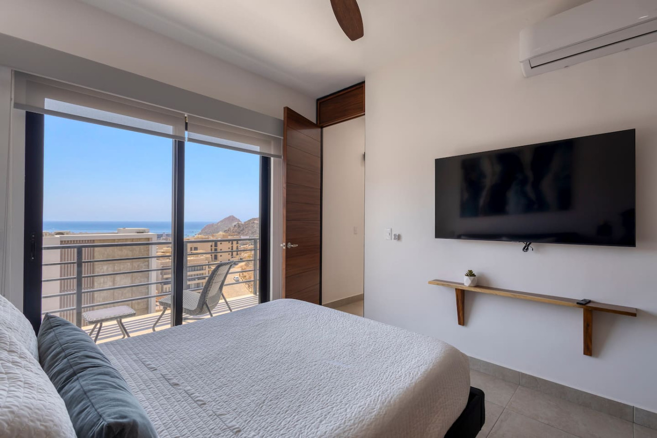 - **Bedroom 1:** Features a queen-size bed with spectacular views, en-suite bathroom, closet, TV, AC, and direct access to the terrace.